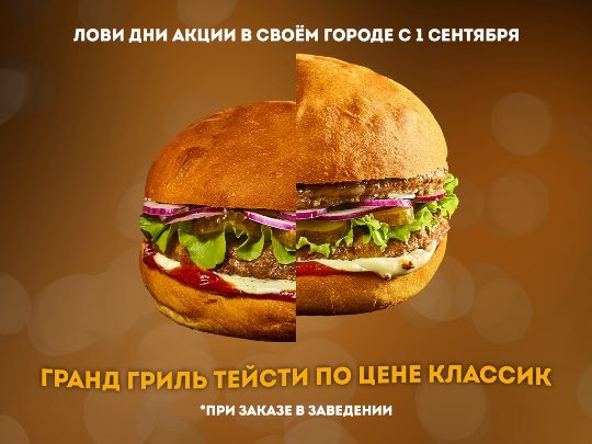 Мы вводим Дни перевоплощения, когда обычный бургер Классик вдруг становится Гранд Гриль Тейсти по цене Классик.